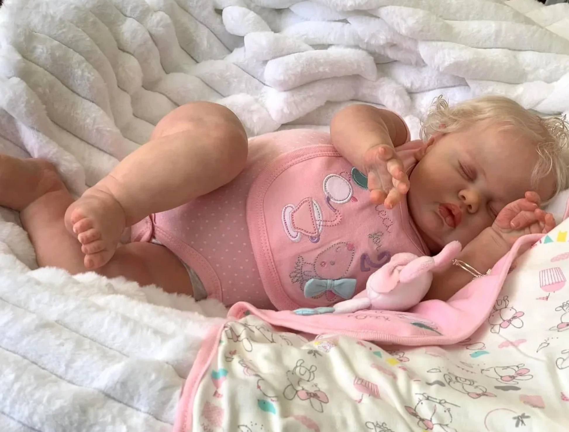 Lernen Sie Amelie kennen – eine zauberhafte 60 cm (24 Zoll) grosse, schlafende Reborn Babypuppe, die mit ihrer friedlichen Ausstrahlung und realistischen Details Herzen im Sturm erobert. Mit ihrem handgepflanzten, seidigen Haar, ihrer realistischen Hautstruktur und ihrem weichen Stoffkörper vermittelt Amelie das Gefühl, ein echtes Baby im Arm zu halten.